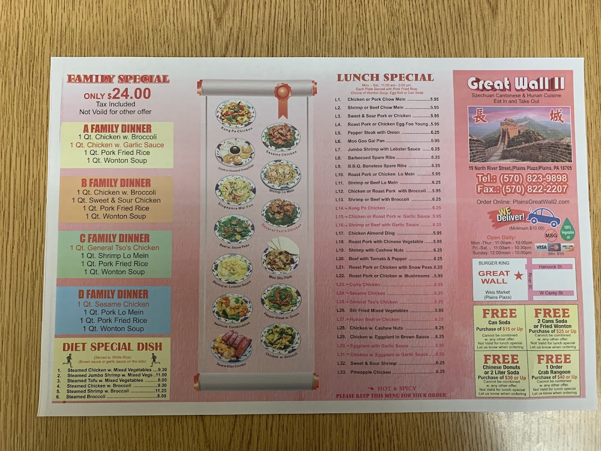 Welcome to Great Wall II, a gem nestled in Plains, PA, where authenticity meets flavor. This renowned Chinese restaurant stands out for its mouthwatering dishes and beloved classics that keep customers returning. From the iconic Sweet and Sour Chicken to the rich Hot and Sour Soup, every bite showcases a commitment to quality and taste.